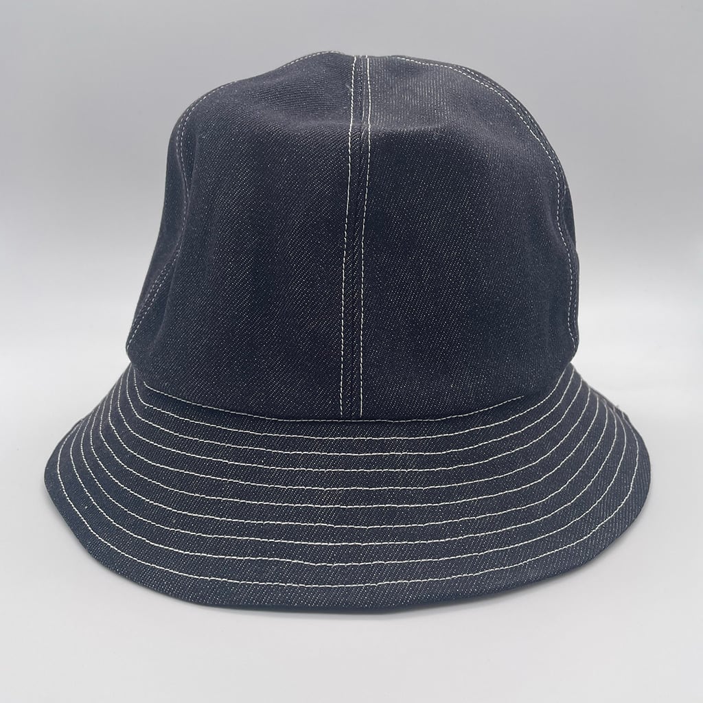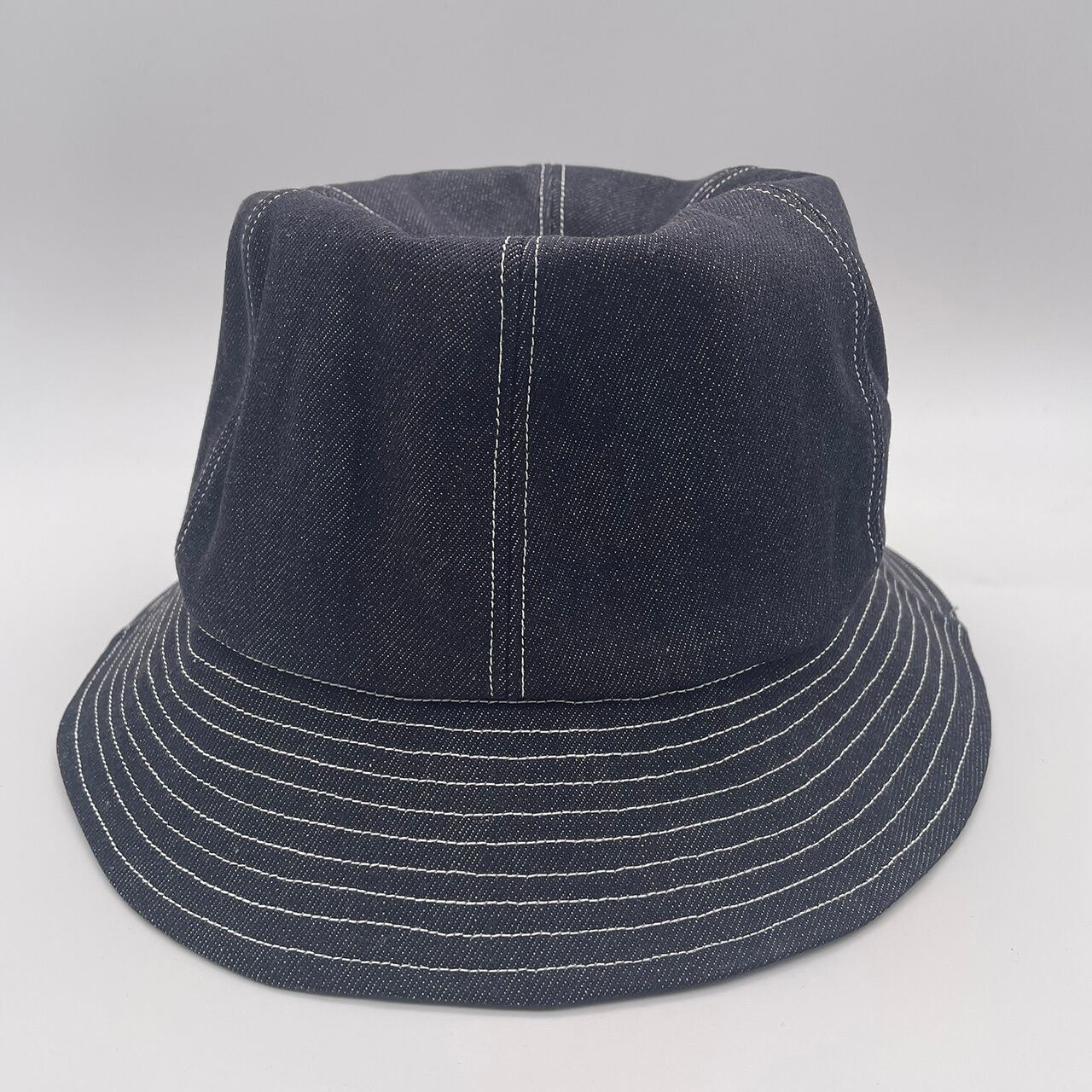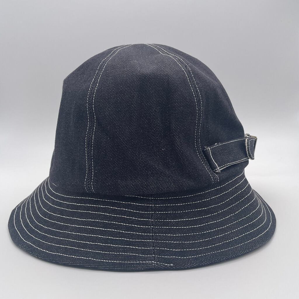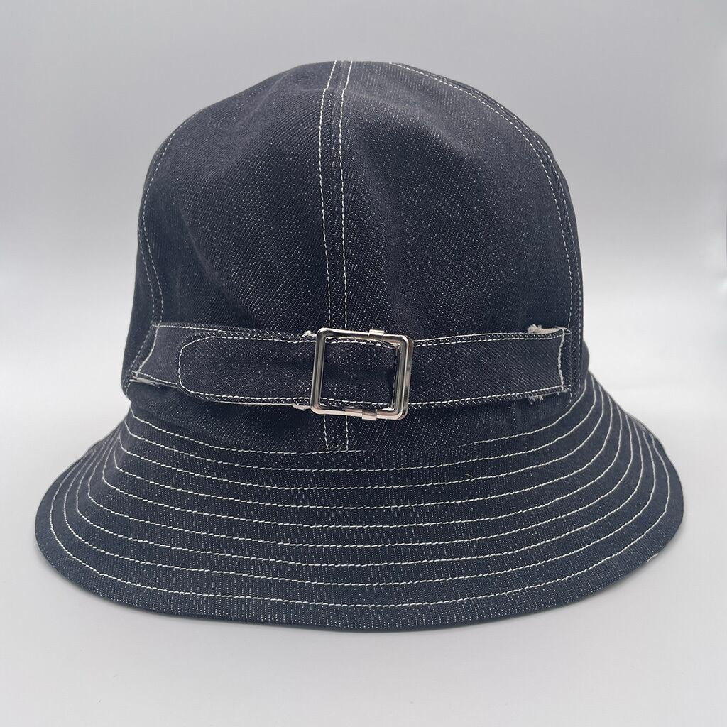 ビッグサイズ(64cm)のバケットハットです。つばを上げたり下げたり、クラウンをへこませたり、色々アレンジして楽しんで頂きたい。バックルストラップ付きのため、サイズを縮小する事が可能。素材はしっかりした13ozの岡山デニム、使い込んだらヴィンテージ感が出る商品です。